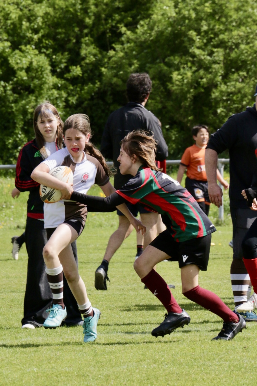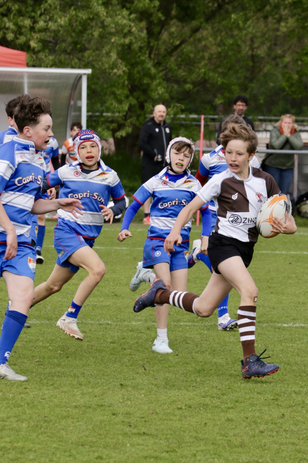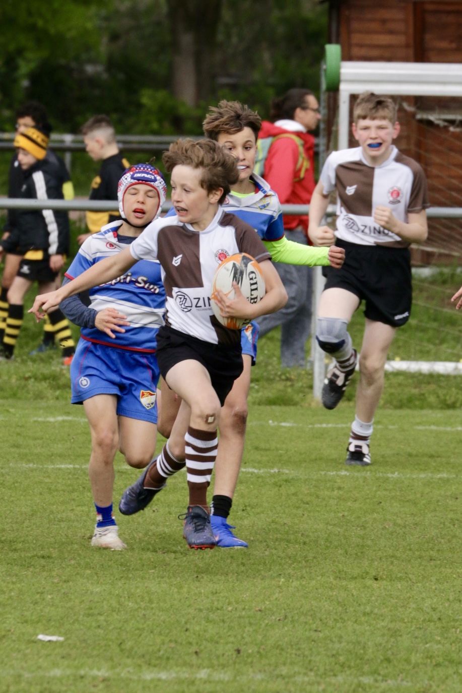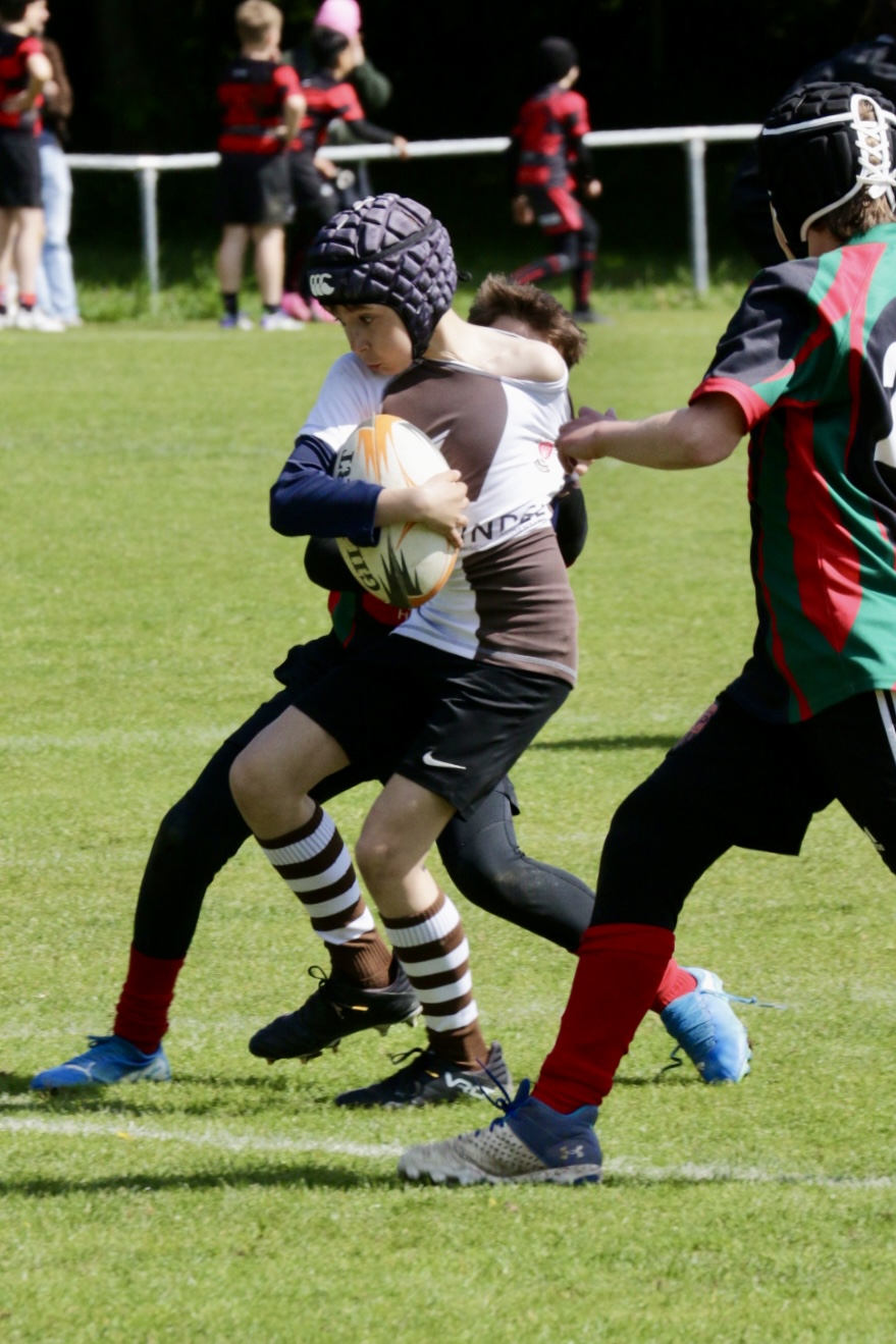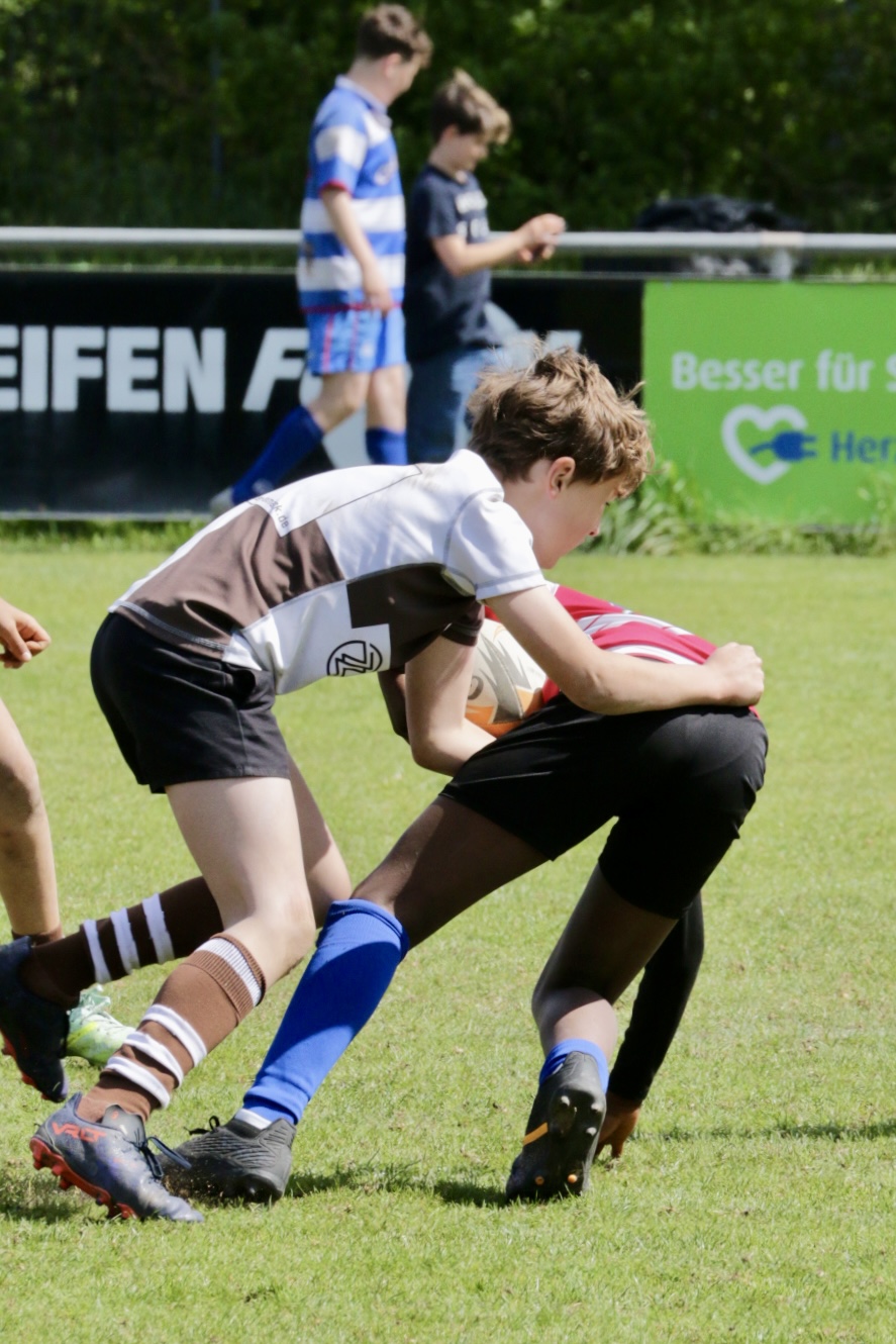 Neben dem „Tour-Feeling“ sind solche Reisen natürlich auch immer ein kleiner Gradmesser, wie man denn so bundesweit sportlich drauf ist, insbesondere wenn so illustre Vereine wie bei dieser Turnierserie am Start sind. Dementsprechend herrschte eine sehr leichte Aufregung und nochmehr Freude auf den ersten Anpfiff. Der kam und unsere Kids zeigten sich an diesem Tag von Anfang an ausgeschlafen. Beide Mannschaften, wirklich alle Spielerinnen und Spieler hauten in den je fünf Spielen alles raus was ging und spielten teilweise ein sehr beeindruckendes Rugby, gegen sehr starke Gegner. Ganz viele Sachen klappten super, die Kids passten, tackelten und rannten und waren knallhart sich selbst und allen anderen gegenüber. So stand am Ende ein sehr schöner Rugbytag zu Buche, an dem die U10 ungeschlagen blieb und insgesamt nur 6 Versuche zuließ. Die U12 zog zwar zwei von fünf Malen den Kürzeren, legte aber in den fünf spielen dafür aller Ehren wert 19 Versuche.