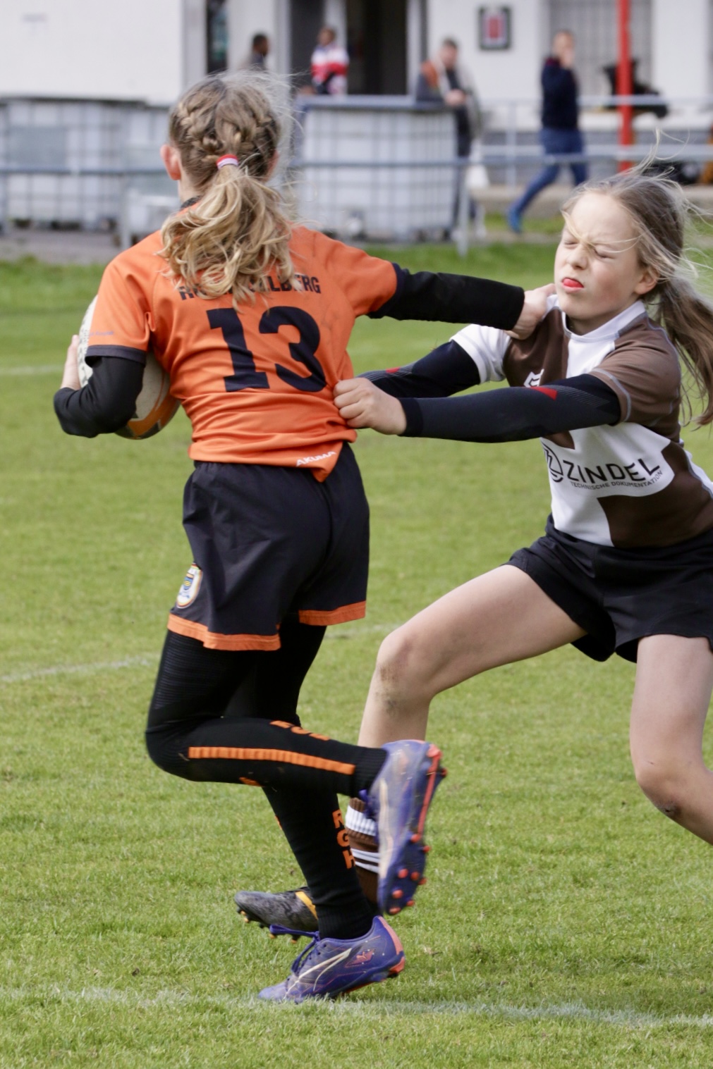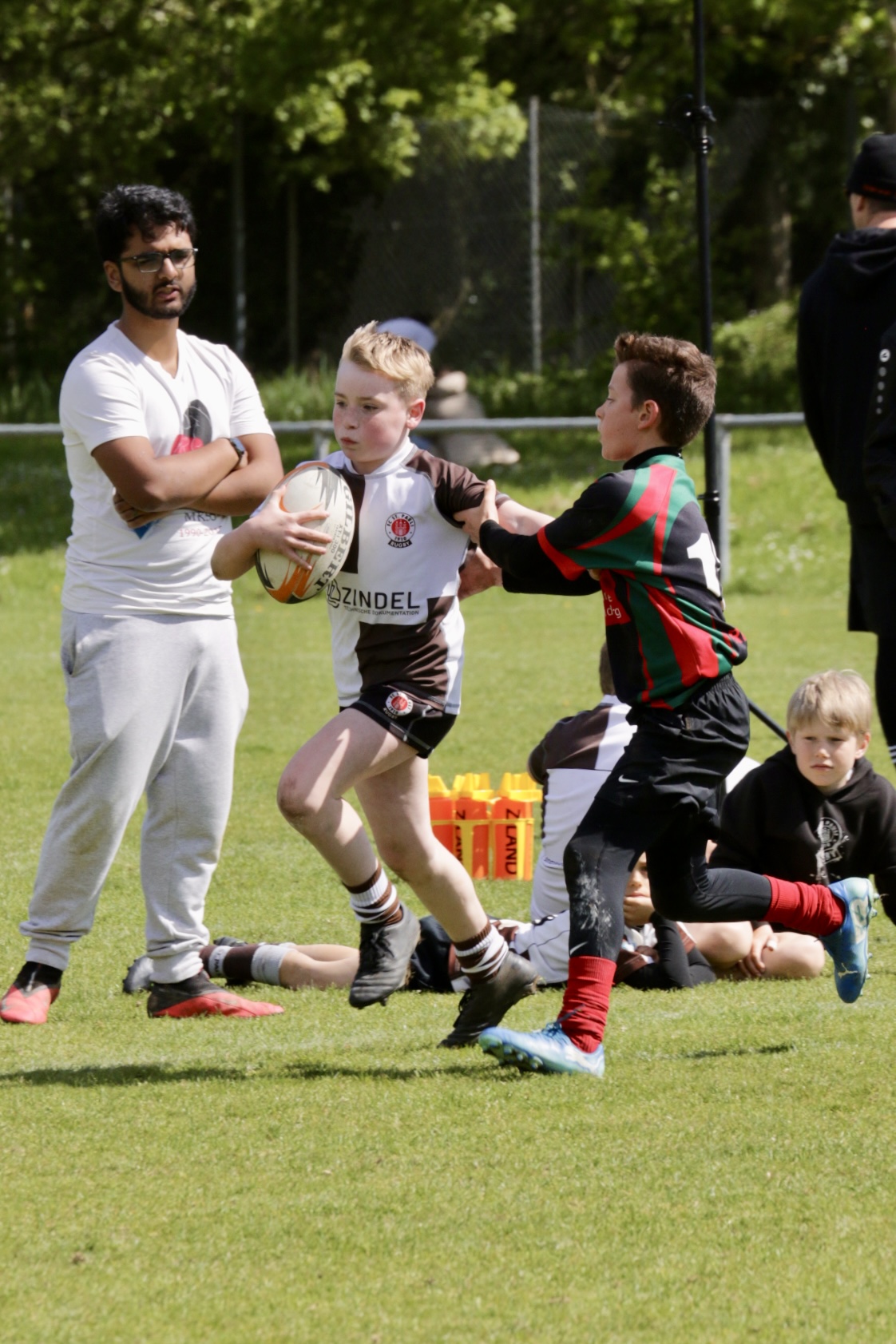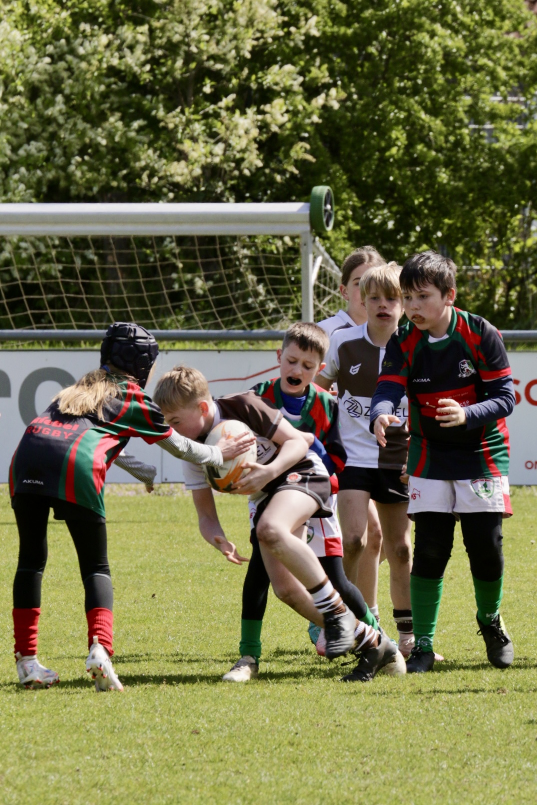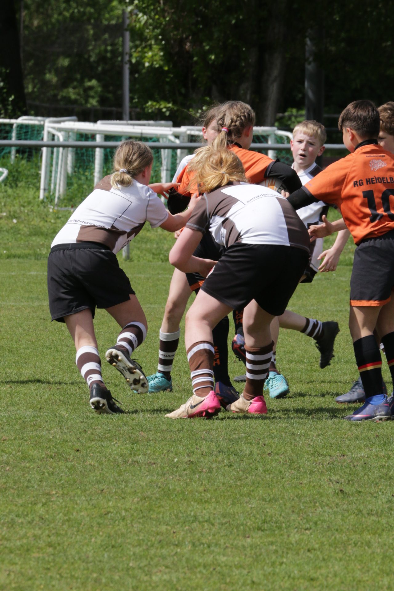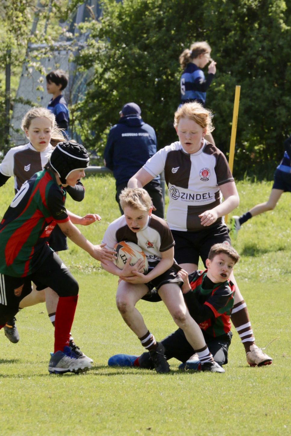 Neben dem „Tour-Feeling“ sind solche Reisen natürlich auch immer ein kleiner Gradmesser, wie man denn so bundesweit sportlich drauf ist, insbesondere wenn so illustre Vereine wie bei dieser Turnierserie am Start sind. Dementsprechend herrschte eine sehr leichte Aufregung und nochmehr Freude auf den ersten Anpfiff. Der kam und unsere Kids zeigten sich an diesem Tag von Anfang an ausgeschlafen. Beide Mannschaften, wirklich alle Spielerinnen und Spieler hauten in den je fünf Spielen alles raus was ging und spielten teilweise ein sehr beeindruckendes Rugby, gegen sehr starke Gegner. Ganz viele Sachen klappten super, die Kids passten, tackelten und rannten und waren knallhart sich selbst und allen anderen gegenüber. So stand am Ende ein sehr schöner Rugbytag zu Buche, an dem die U10 ungeschlagen blieb und insgesamt nur 6 Versuche zuließ. Die U12 zog zwar zwei von fünf Malen den Kürzeren, legte aber in den fünf spielen dafür aller Ehren wert 19 Versuche.