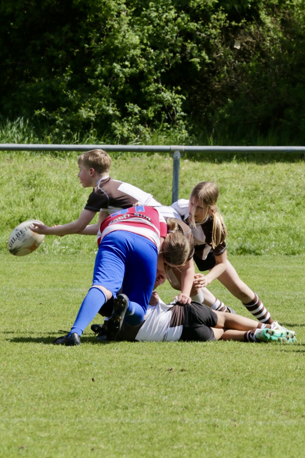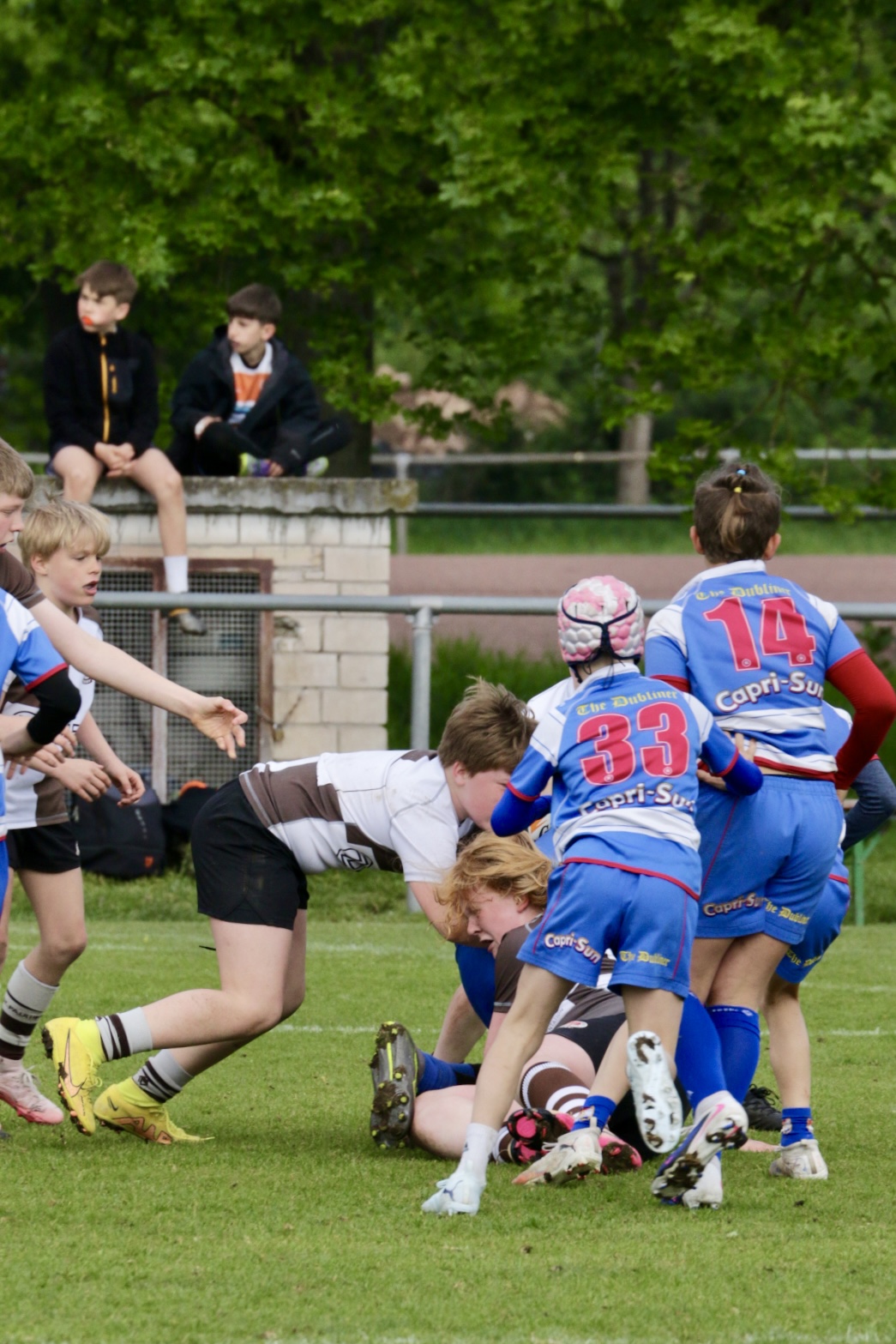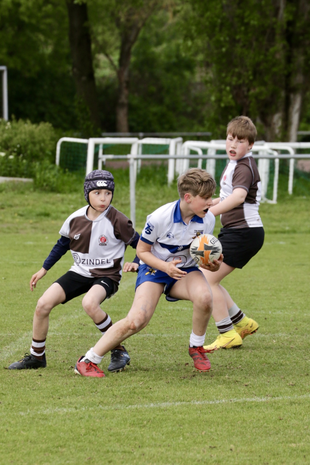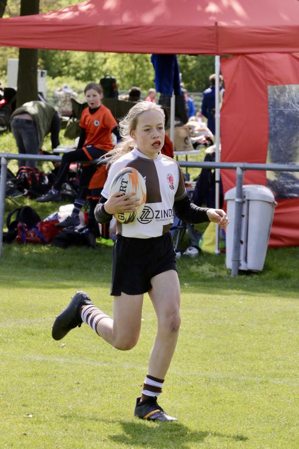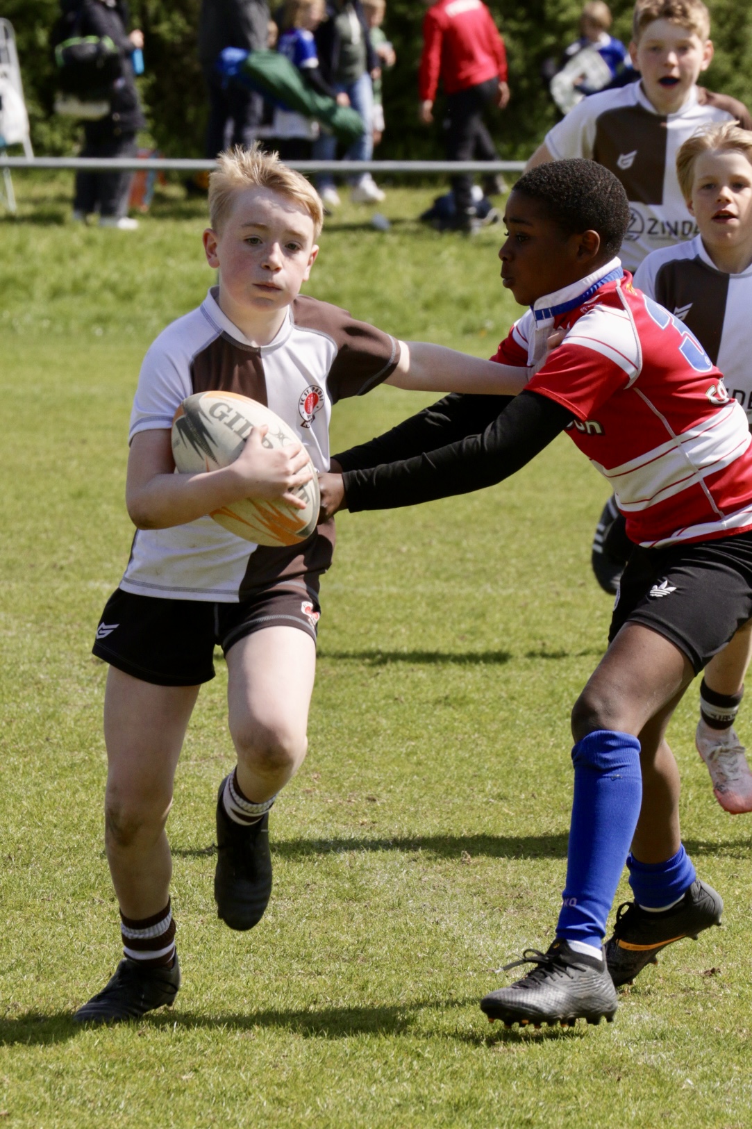 Neben dem „Tour-Feeling“ sind solche Reisen natürlich auch immer ein kleiner Gradmesser, wie man denn so bundesweit sportlich drauf ist, insbesondere wenn so illustre Vereine wie bei dieser Turnierserie am Start sind. Dementsprechend herrschte eine sehr leichte Aufregung und nochmehr Freude auf den ersten Anpfiff. Der kam und unsere Kids zeigten sich an diesem Tag von Anfang an ausgeschlafen. Beide Mannschaften, wirklich alle Spielerinnen und Spieler hauten in den je fünf Spielen alles raus was ging und spielten teilweise ein sehr beeindruckendes Rugby, gegen sehr starke Gegner. Ganz viele Sachen klappten super, die Kids passten, tackelten und rannten und waren knallhart sich selbst und allen anderen gegenüber. So stand am Ende ein sehr schöner Rugbytag zu Buche, an dem die U10 ungeschlagen blieb und insgesamt nur 6 Versuche zuließ. Die U12 zog zwar zwei von fünf Malen den Kürzeren, legte aber in den fünf spielen dafür aller Ehren wert 19 Versuche.