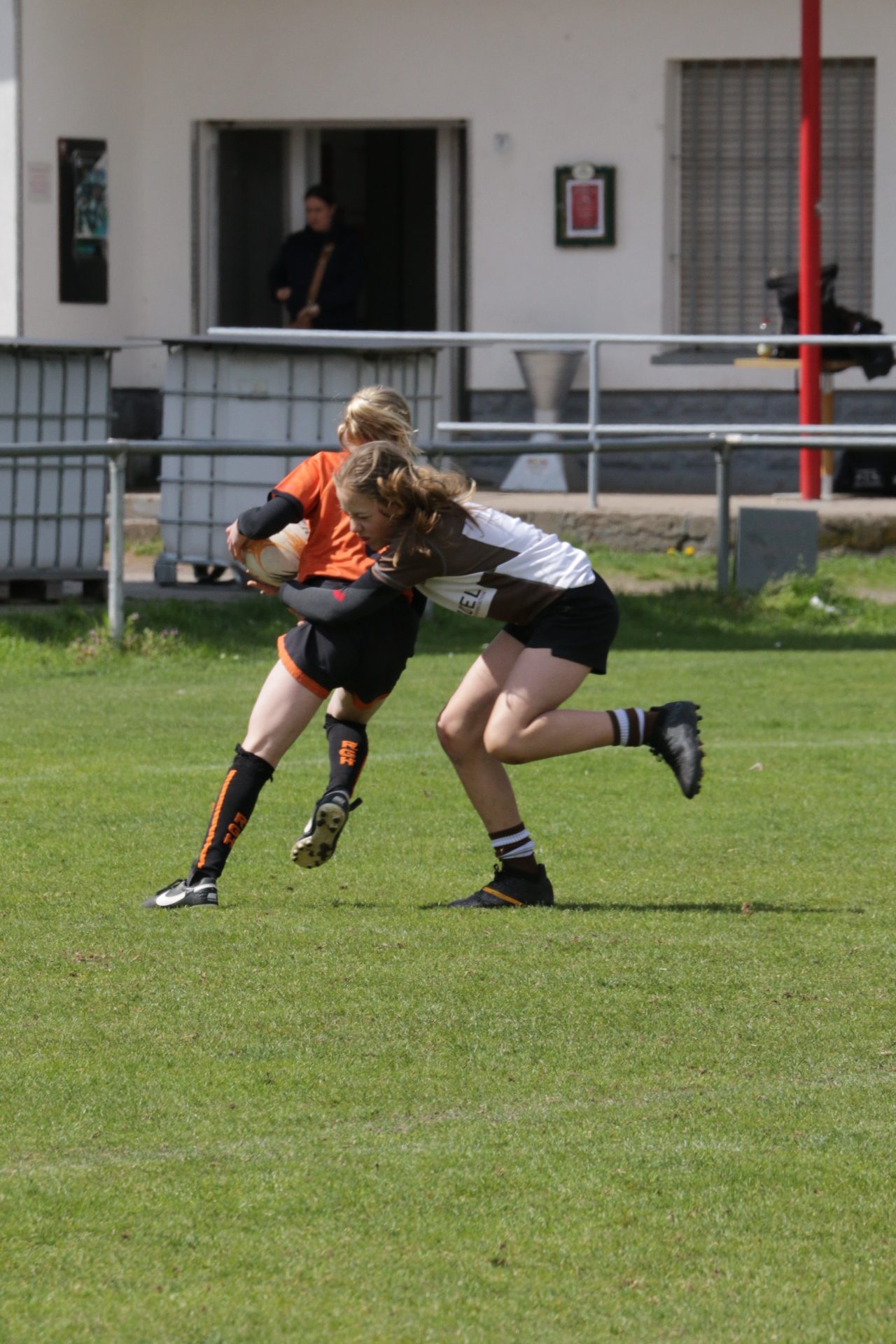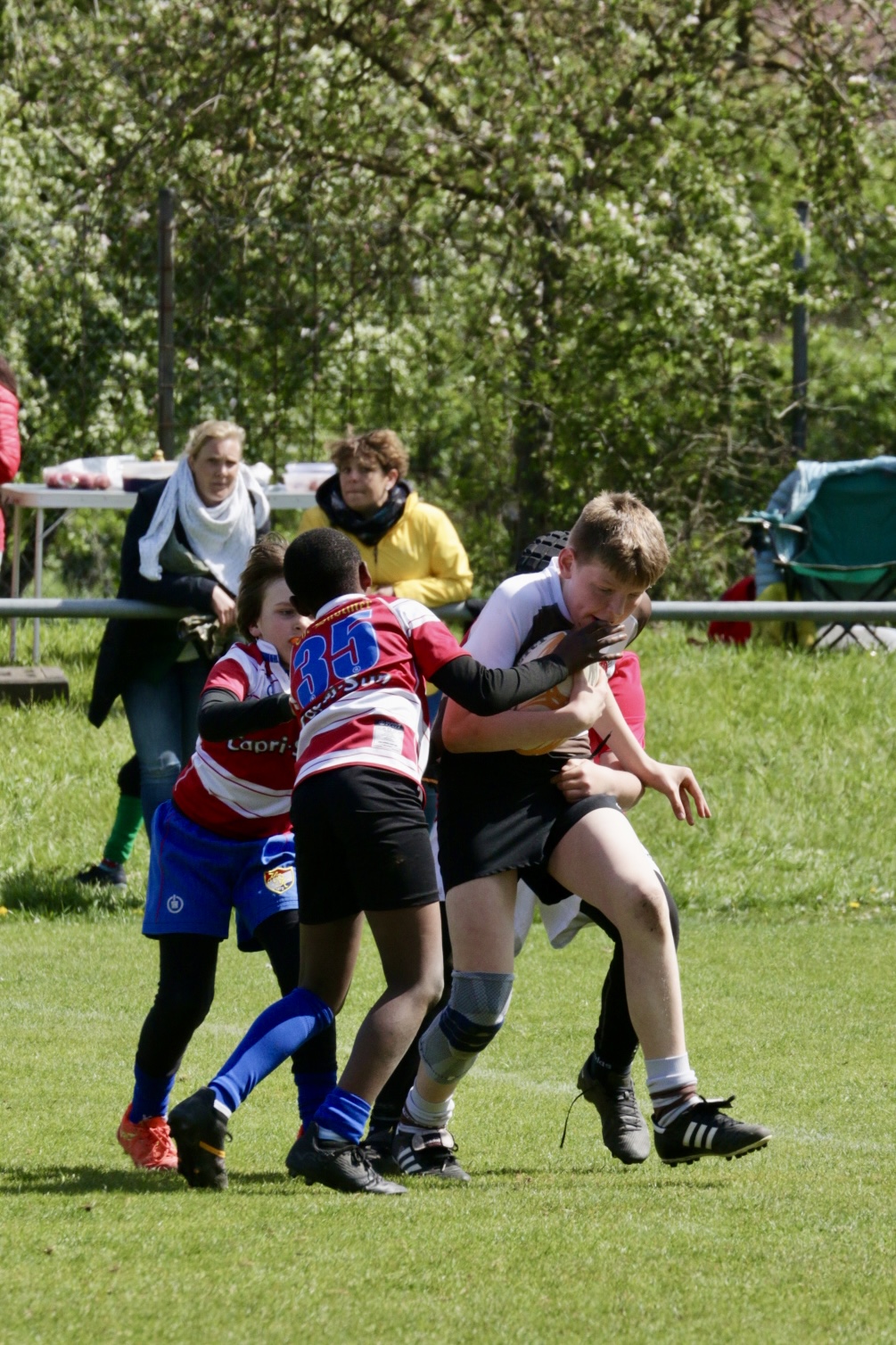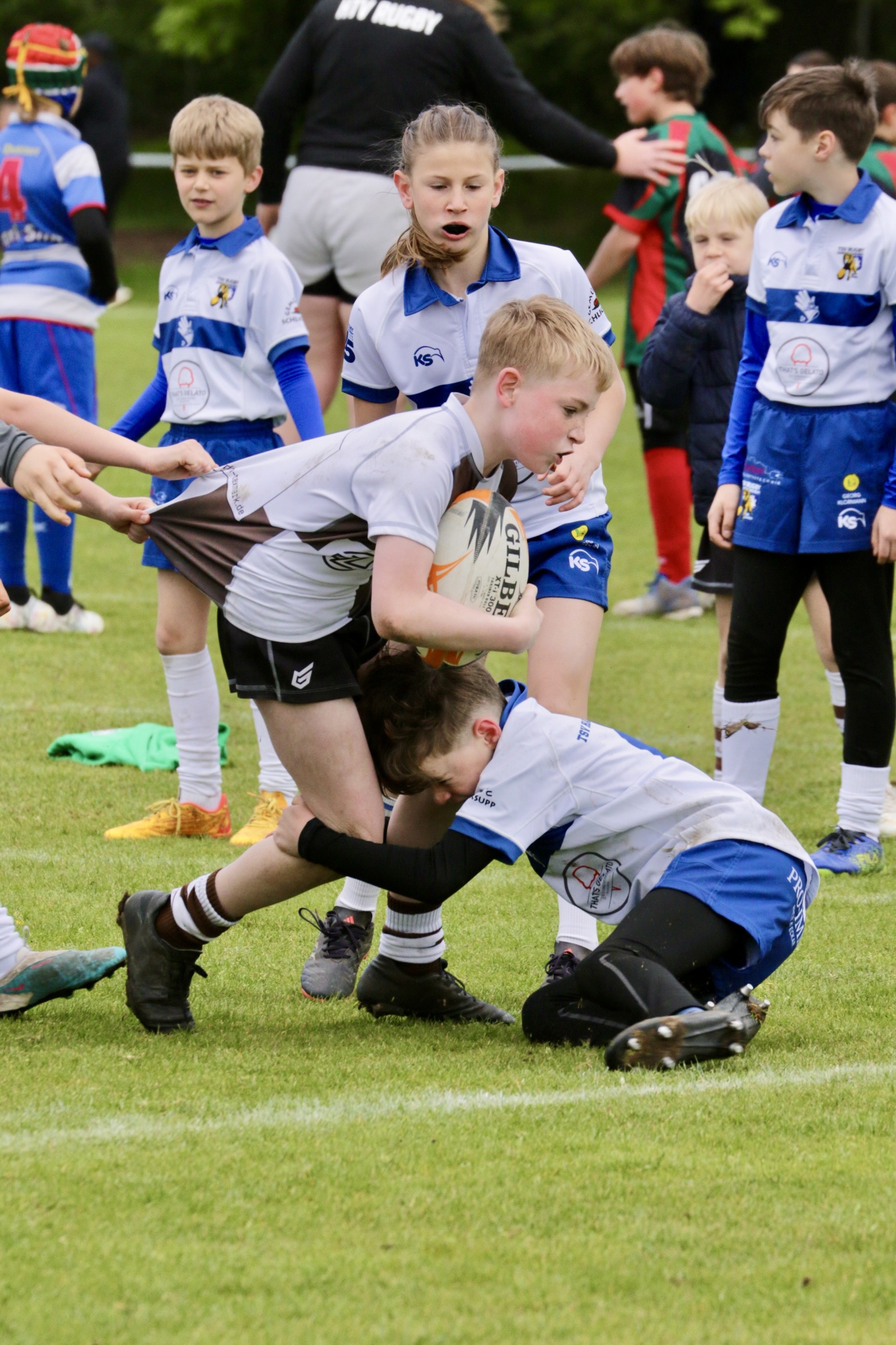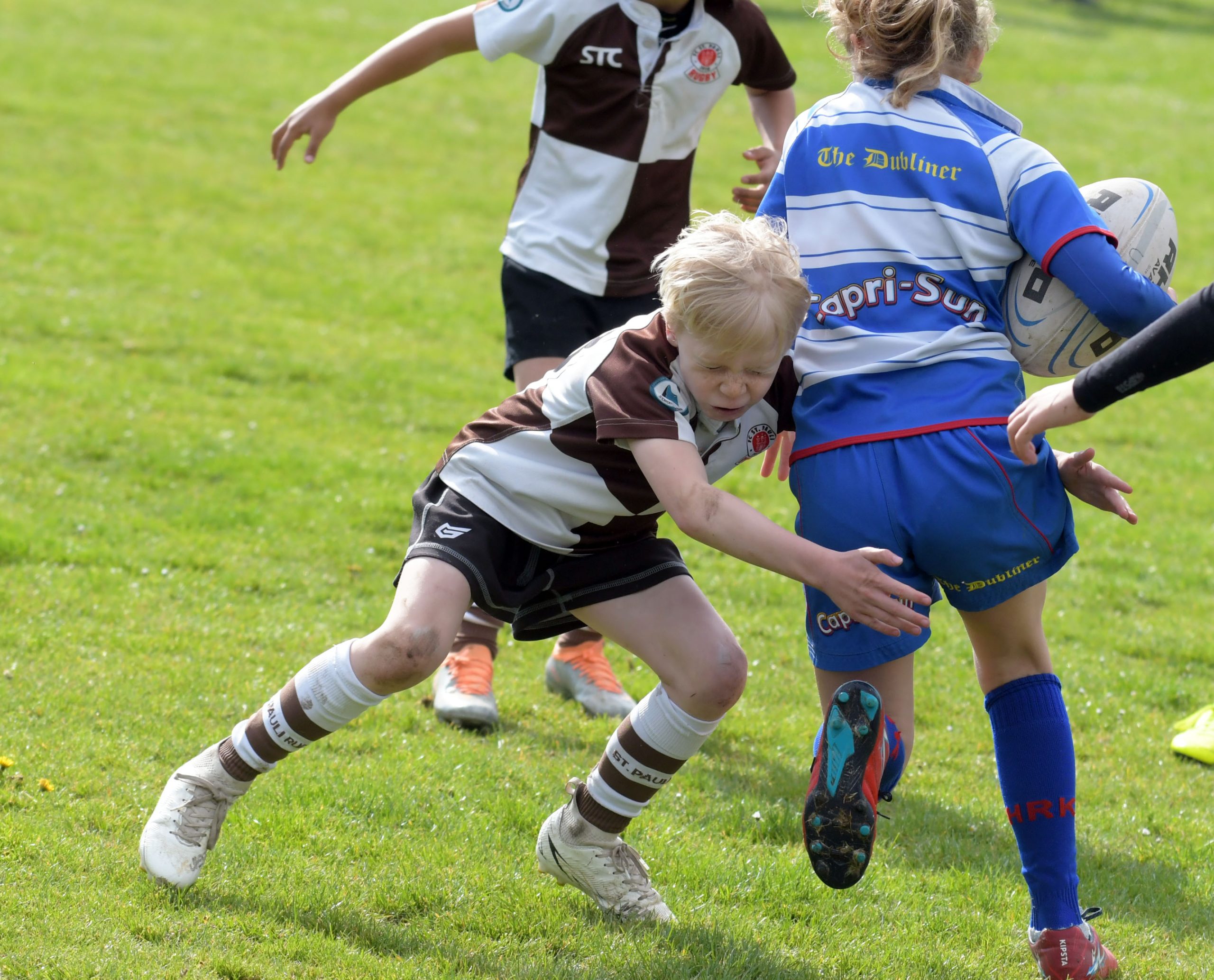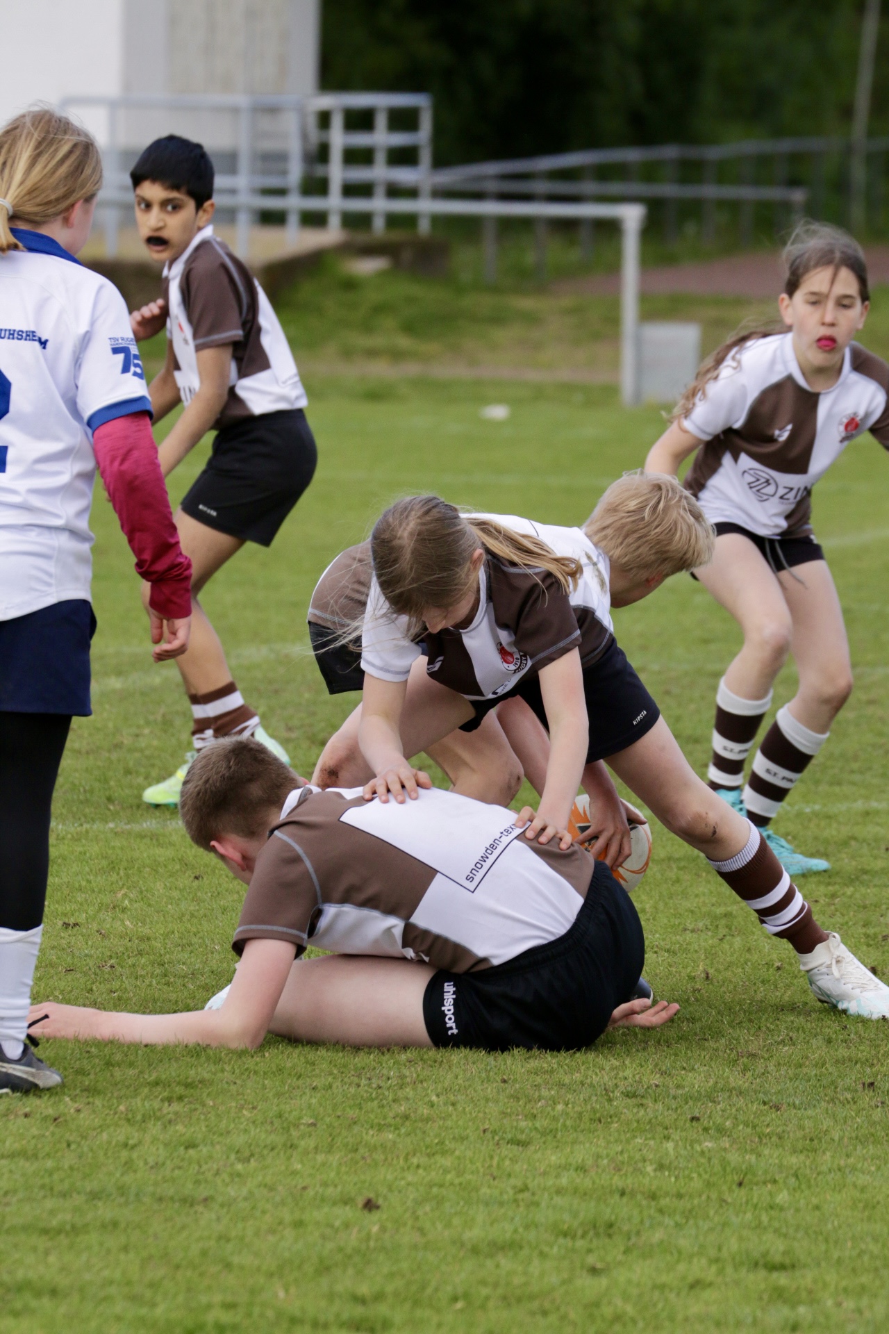 Neben dem „Tour-Feeling“ sind solche Reisen natürlich auch immer ein kleiner Gradmesser, wie man denn so bundesweit sportlich drauf ist, insbesondere wenn so illustre Vereine wie bei dieser Turnierserie am Start sind. Dementsprechend herrschte eine sehr leichte Aufregung und nochmehr Freude auf den ersten Anpfiff. Der kam und unsere Kids zeigten sich an diesem Tag von Anfang an ausgeschlafen. Beide Mannschaften, wirklich alle Spielerinnen und Spieler hauten in den je fünf Spielen alles raus was ging und spielten teilweise ein sehr beeindruckendes Rugby, gegen sehr starke Gegner. Ganz viele Sachen klappten super, die Kids passten, tackelten und rannten und waren knallhart sich selbst und allen anderen gegenüber. So stand am Ende ein sehr schöner Rugbytag zu Buche, an dem die U10 ungeschlagen blieb und insgesamt nur 6 Versuche zuließ. Die U12 zog zwar zwei von fünf Malen den Kürzeren, legte aber in den fünf spielen dafür aller Ehren wert 19 Versuche.