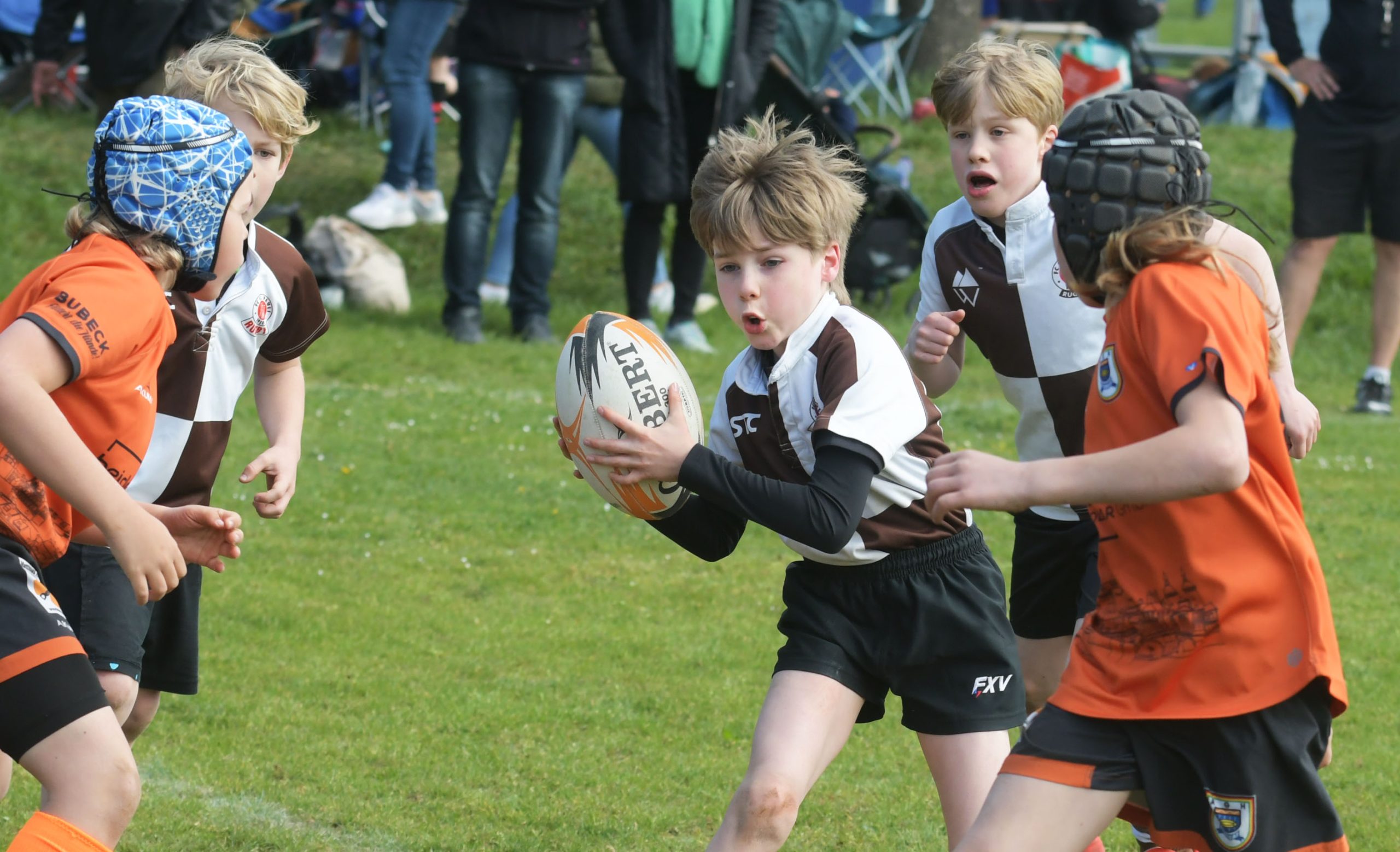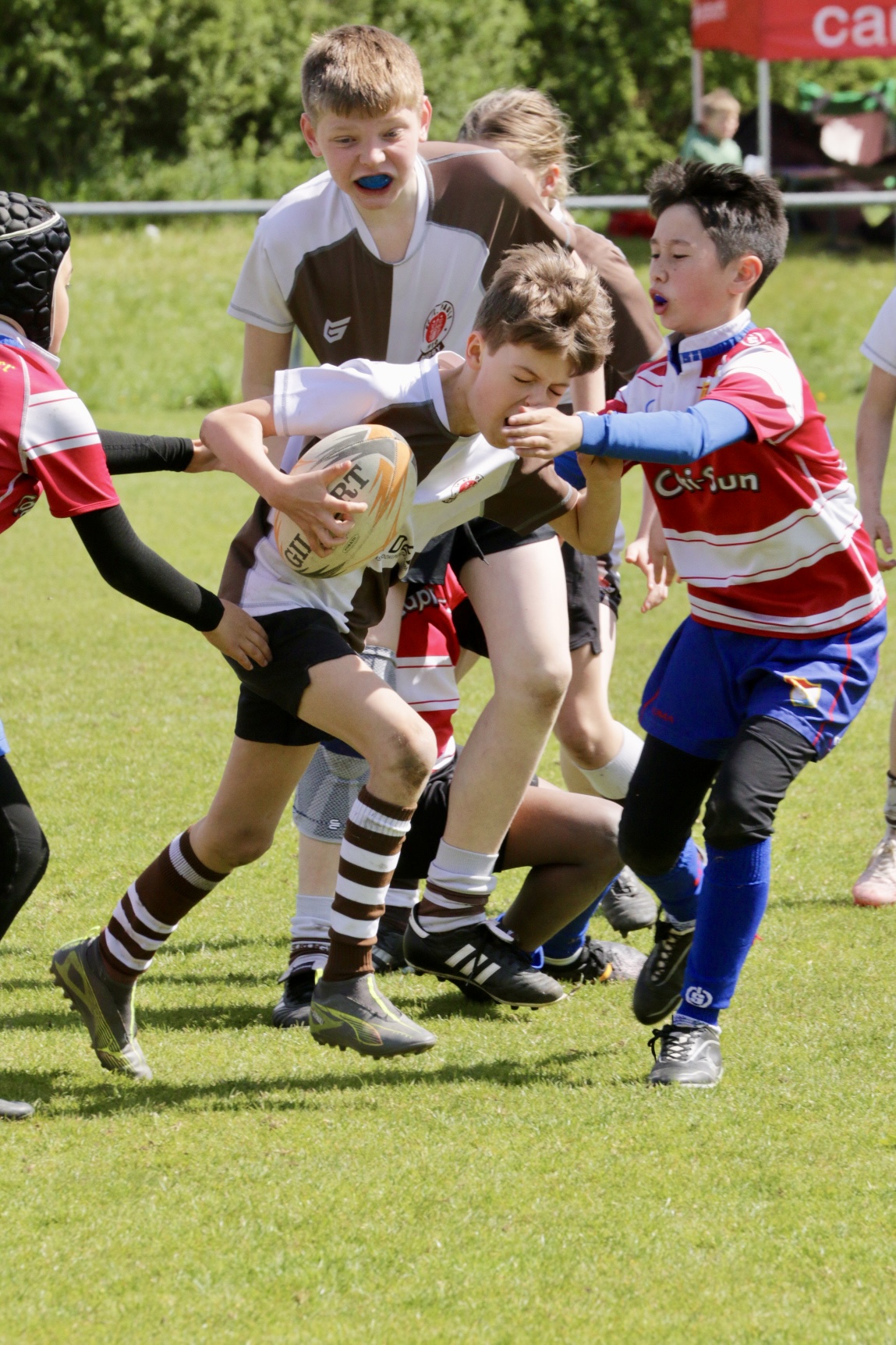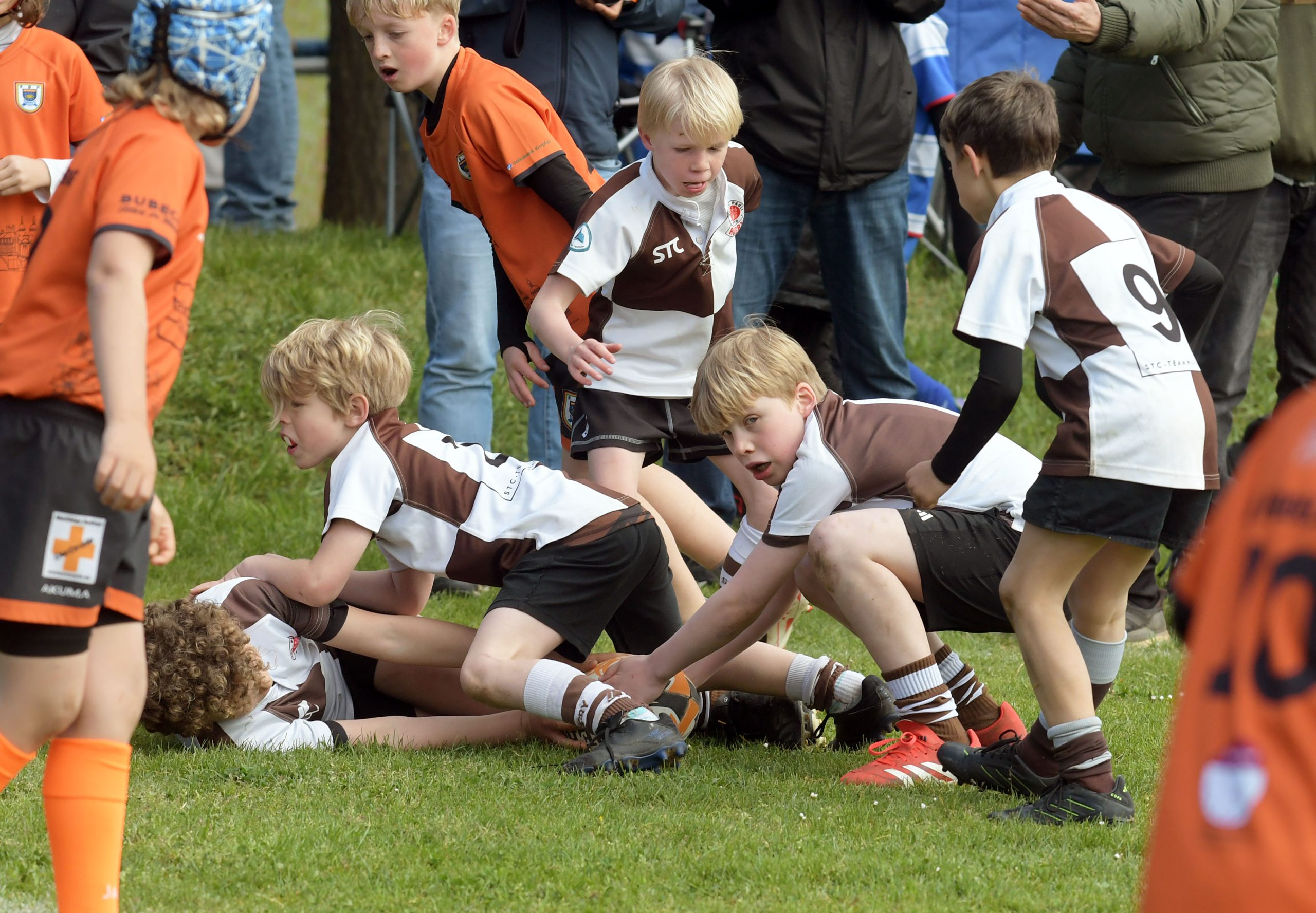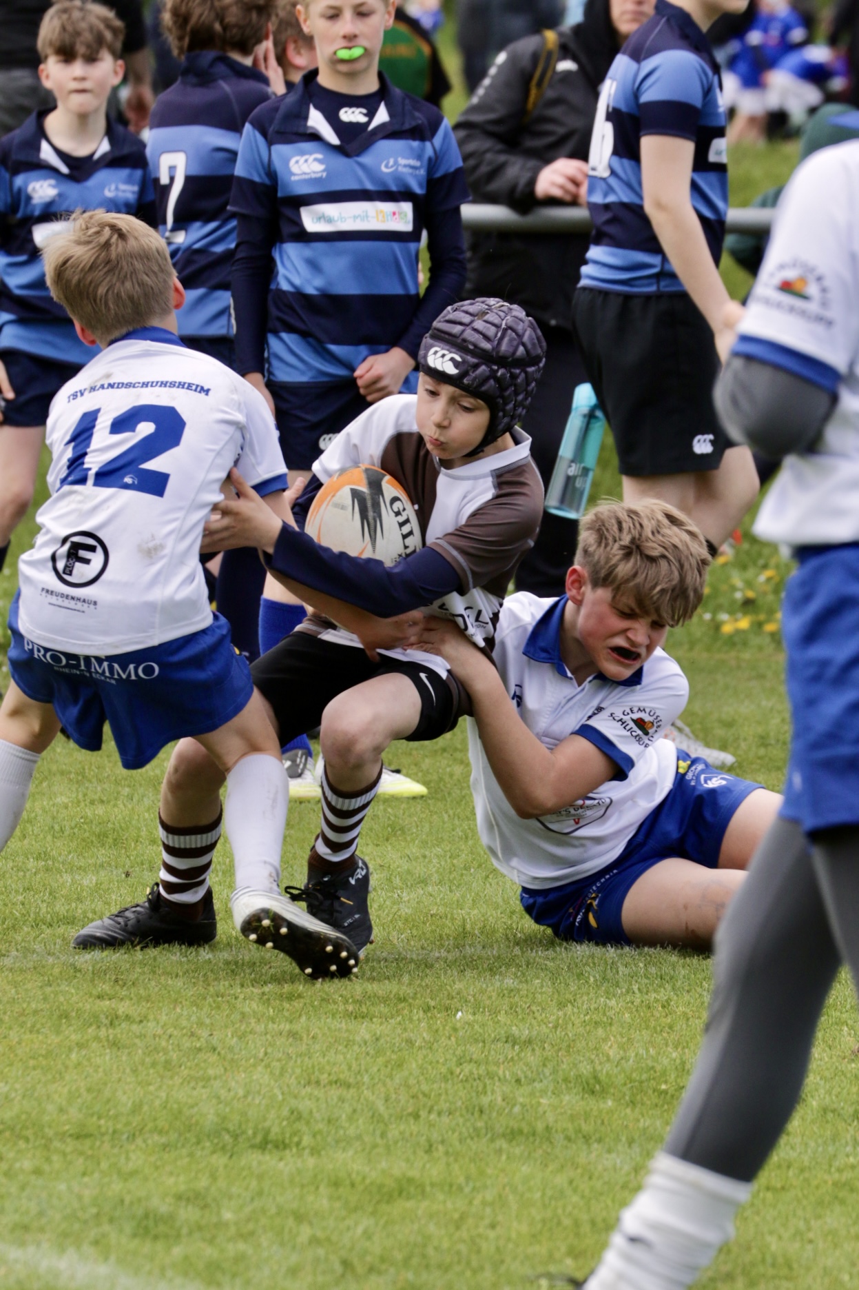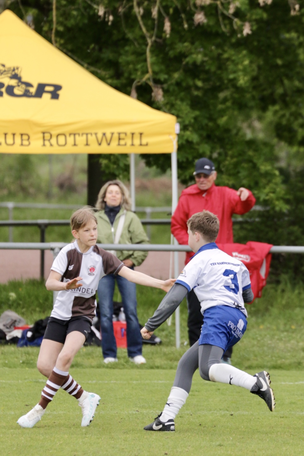 Neben dem „Tour-Feeling“ sind solche Reisen natürlich auch immer ein kleiner Gradmesser, wie man denn so bundesweit sportlich drauf ist, insbesondere wenn so illustre Vereine wie bei dieser Turnierserie am Start sind. Dementsprechend herrschte eine sehr leichte Aufregung und nochmehr Freude auf den ersten Anpfiff. Der kam und unsere Kids zeigten sich an diesem Tag von Anfang an ausgeschlafen. Beide Mannschaften, wirklich alle Spielerinnen und Spieler hauten in den je fünf Spielen alles raus was ging und spielten teilweise ein sehr beeindruckendes Rugby, gegen sehr starke Gegner. Ganz viele Sachen klappten super, die Kids passten, tackelten und rannten und waren knallhart sich selbst und allen anderen gegenüber. So stand am Ende ein sehr schöner Rugbytag zu Buche, an dem die U10 ungeschlagen blieb und insgesamt nur 6 Versuche zuließ. Die U12 zog zwar zwei von fünf Malen den Kürzeren, legte aber in den fünf spielen dafür aller Ehren wert 19 Versuche.