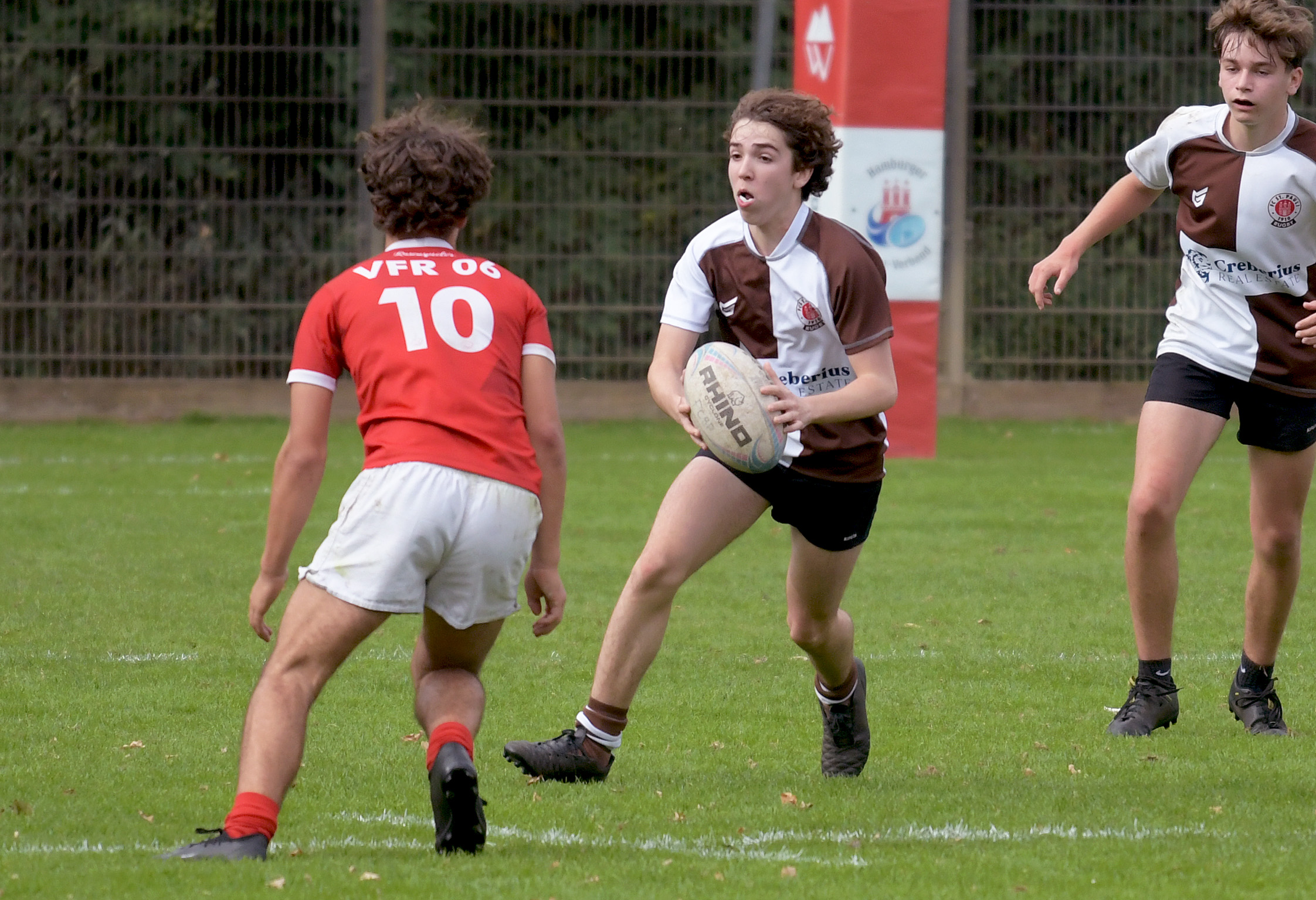 Die Mannschaft zeigte sich am Samstag gegen die SG VFR Döhren / Ricklingen08 in guter körperlicher und mentaler Verfassung. Sowohl die wenigen erfahrenen Spieler aus dem zweiten Jahrgang der U16, als auch diejenigen die ihren Weg in dieser Altersklasse begonnen hatten. Sie entfalteten den Angriff mit gutem Handspiel und Entschlossenheit. Bei den Stürmern ragten die bereits erfahrenen Josha, Joshua, Mattia und Momme heraus. Die Rückkehr von Raheem (3 Versuche) in das Team war bemerkenswert. Das Paar N9-N10, Leo und Bauti, bestritten ihr erstes gemeinsames Spiel und erspielten sich den Beginn einer festen Paarung für die Saison. Die ersten Schritte der Umsetzung des Systems im Training waren bereits in den ersten vier Angriffen des Spiels deutlich zu sehen. Und auch wenn noch nicht alles ganz geklappt hat, war das Potenzial dieser Mannschaft deutlich zu erkennen.